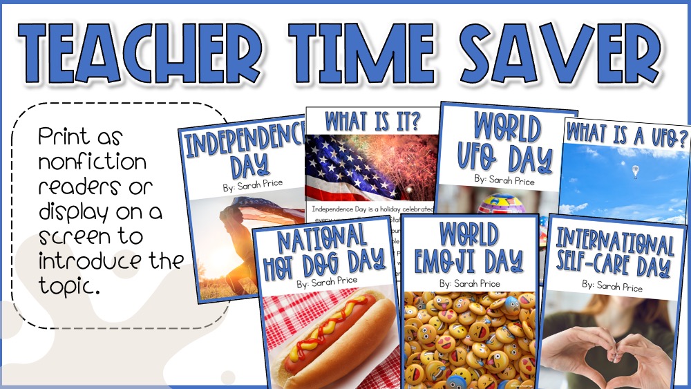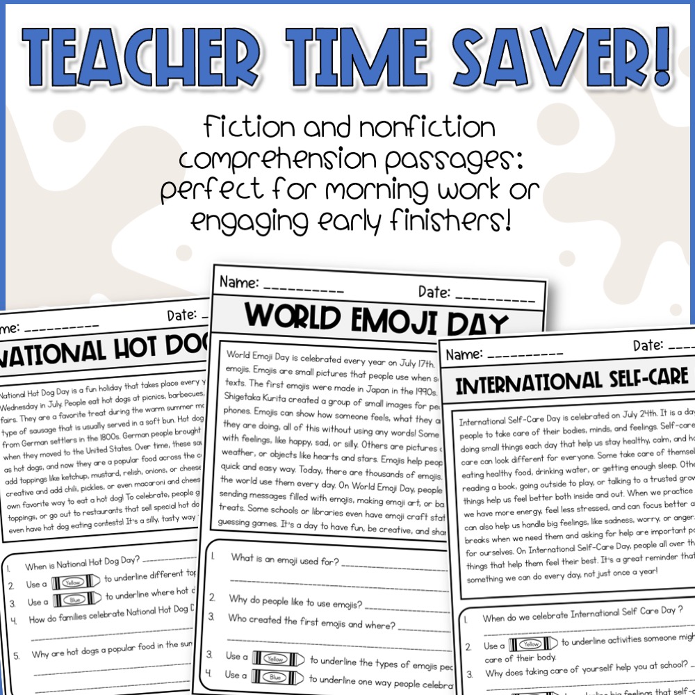 This printable resource features July-themed nonfiction readers, along with 10 engaging reading passages—a mix of fiction and nonfiction—all based on kid-friendly, real-world July holidays, such as Independence Day, World Emoji Day, and National Hot Dog Day. It’s the perfect no-prep solution for summer school, homeschool, sub plans, or independent practice at home.